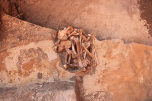 Quelle: Umgelagerte Bestattungen (G_2423_2020_00092) – Block 2.2 Ausgrabungen Als der Platz auf dem Friedhof in der Frühen Neuzeit knapp wurde, wurden alte Bestattungen umgelagert und die Knochen gemeinsam auf kleinem Raum deponiert. Dadurch wurde Platz geschaffe