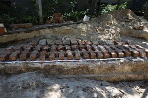 Quelle: Abb.: Freigelegte Kreuzrippensteine der Moritzkirche (IMG_4158) – Block 2.5 Baukeramik Aus der Verfüllung der Sakristei konnten diverse Bauteile der Moritzkirche geborgen werden, wozu besonders viele Kreuzrippensteine und Mauerziegel im sogenannten Kloste