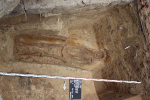 Quelle: Abb.: Bestattung in der Sakristei (G_890_2023_00325) – Block 2.2 Ausgrabung Diese mittelalterliche Bestattung wurde in der Sakristei der Moritzkirche vorgenommen. Diese besondere Lage ist auch ein Hinweis auf eine besondere Stellung des Individuums. Bildq