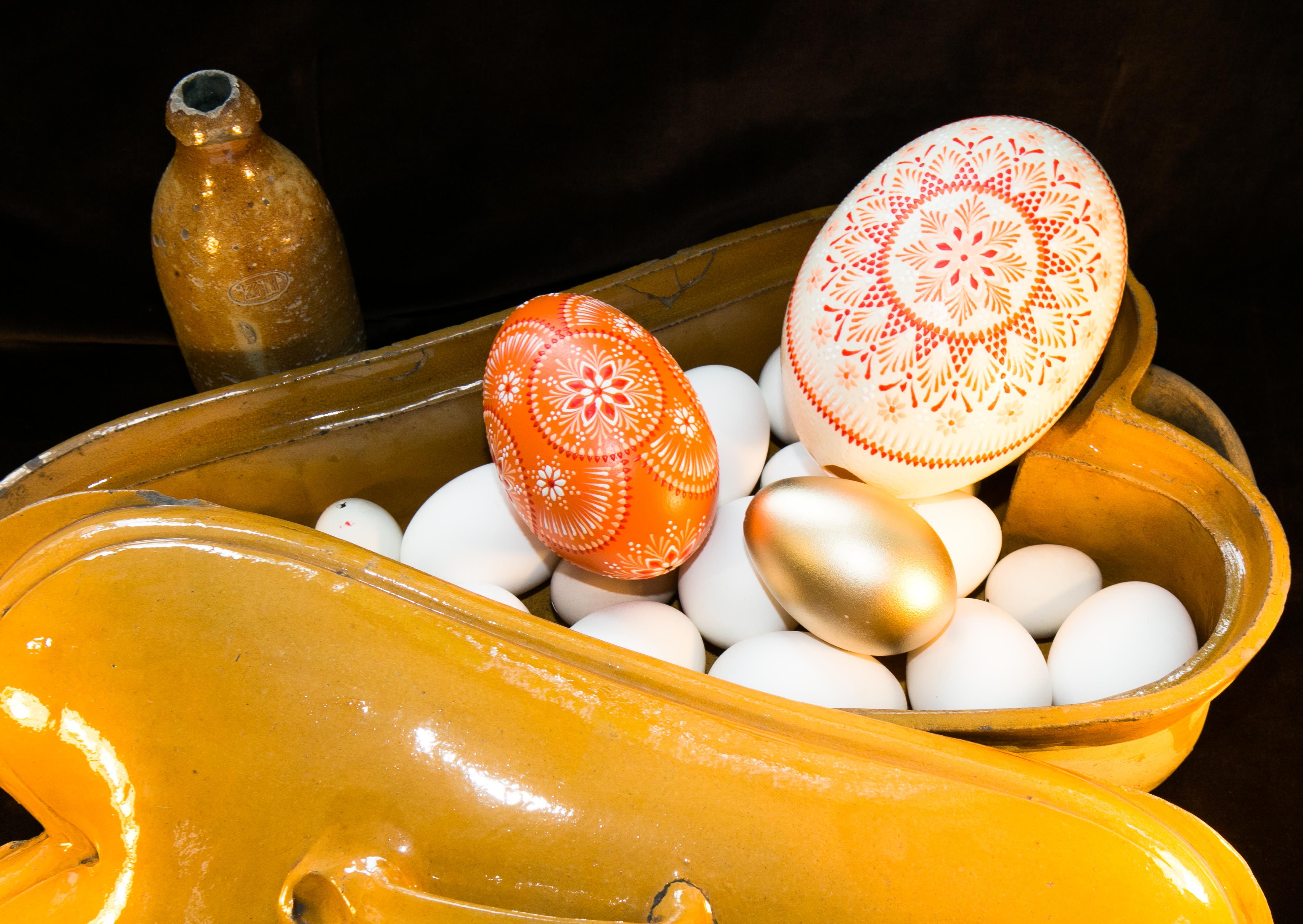 Österlich wird es in der Sonderausstellung „Wenn der Zweck die Form bestimmt - Bäuerliche Gebrauchskeramik“. Vom Gärtopf bis zur Puddingform, von der Flasche bis zum bemalten Tonkrug steht hier die schlichte Schönheit bäuerlicher Keramiken im Fokus. Den matten Erdfarben und Blautönen der Gefäße steht die leuchtende Farbenvielfalt traditioneller sorbischer Ostereier gegenüber, welche die Formensammlung bis zum 12. April ergänzen. Daneben können die Besucherinnen und Besucher typische Ostergebäcke aus der ganzen Welt vom polnischen „Makowiec“ über den italienischen „Colomba de Pasqua“ bis zum britischen „Simnel Cake“ und ihre Geschichten entdecken.