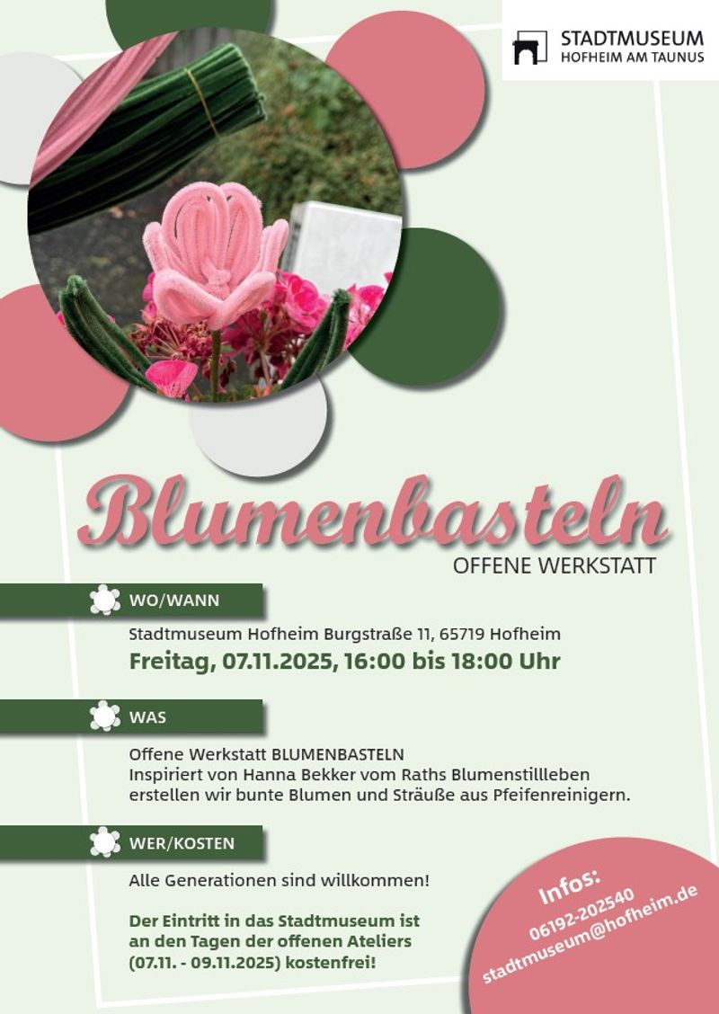 Während der Tage der offenen Ateliers 2025 lädt das Stadtmuseum am Freitag 07.11.2025 von 16.00 bis 18.00 Uhr zum Blumenbasteln in der Museumswerkstatt ein - der Eintritt ist frei!