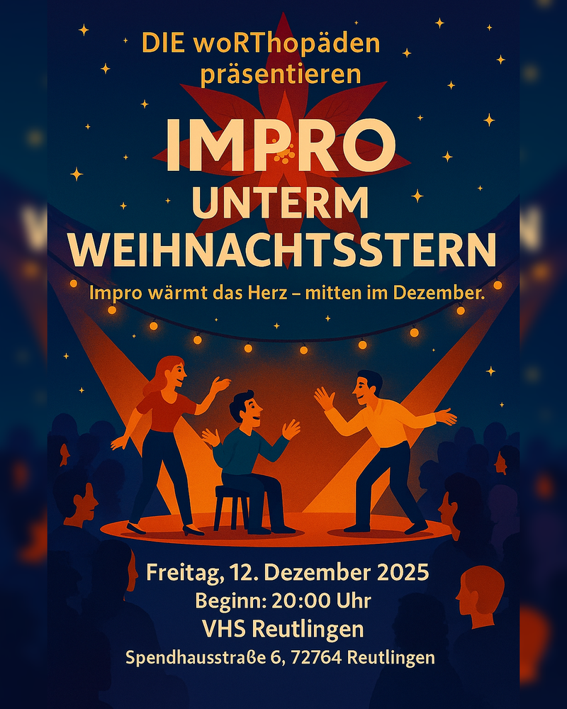 Die WoRThopäden improvisieren eine ganze Weihnachts-Show nur auf Basis spontaner Stichwörter aus dem Publikum. Aus euren Ideen entstehen live Geschichten rund um Geschenkestress, Glühweinmomente und kleine Weihnachtswunder – mal laut und komisch, mal leise und berührend.