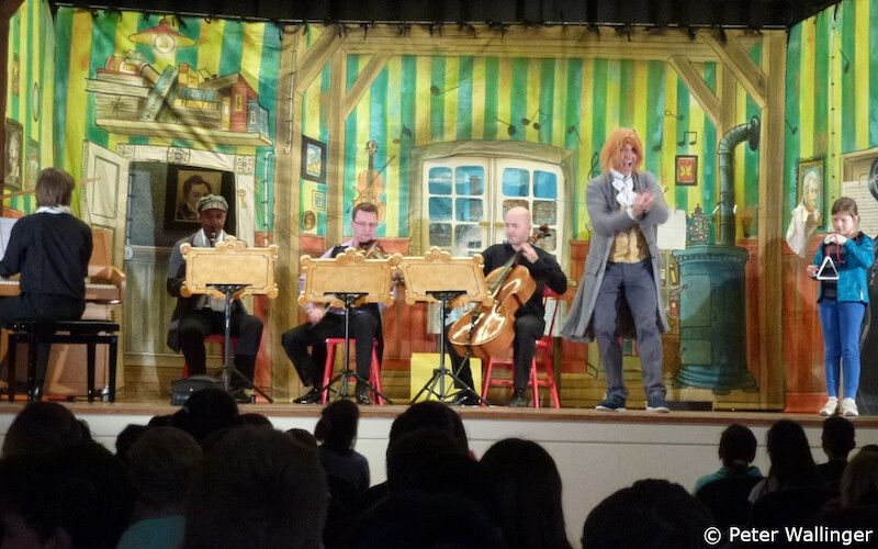 Mo., 23.03.2026 Di., 24.03.2026 Mi., 25.03.2026 Jeweils 9.15 und 10.45 Uhr Kelter Herr Buffo und der Notendieb Musik-Krimi für kleine Detektive von Jörg Schade für die Kinder der Klassen 1 bis 5 mit Musik arrangiert von Prof. Andreas Tarkmann Mit Jörg Schade als Antonio Buffo und Dorit Meyer-Gastell als Mrs. Clearwater sowie Mitgliedern der „sueddeutschen kammersinfonie bietigheim“ in der Besetzung Klarinette, Violine, Violoncello und Klavier Der Komponist und Musiktüftler Antonio Buffo ist vielbeschäftigt. Er erfindet kleine Musikstücke und Weckmelodien, oder repariert defekte Noten. Mit seinen vier Musikern arbeitet er tagtäglich in seiner bunten Dachkammer. Doch während der Arbeit an den Musikstücken passieren in letzter Zeit mysteriöse Dinge: Zuerst sind nur ein paar Noten durcheinander geraten, doch dann verschwindet ein ganzes „Kuchenduett“ dass Herr Buffo für Bäcker Krapfmeyer geschrieben hat. Also beschließen Herr Buffo und seine Musiker dem Notendieb auf die Spur zu kommen. Eine professionelle Detektivin wird eingeschaltet, die zufälligerweise eine Etage tiefer wohnt. Mit Unterstützung des jungen Publikums, macht sie sich an die Lösung des verzwickten Falles. War es der Mann an der Klarinette, der immer zu spät kommt? Oder der immer hungrige Cellist, oder gar die vergessliche Geigerin? Herr Buffo ist ratlos. Und die Zeit drängt. Wird es gelingen den Notendieb zu fassen, damit Antonio Buffo das kleine Kuchenduett rechtzeitig abliefern kann...? Information/Buchung nur für Schulklassen unter kulturamt@bietigheim-bissingen.de Karten 5 € Bild: Peter Wallinger