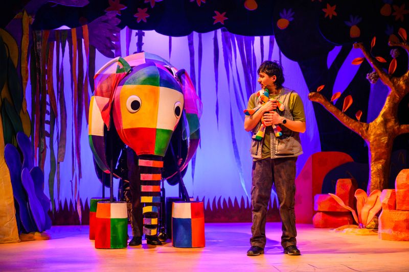 Begleite drei Abenteurer auf einer fröhlichen Dschungelreise in Tall Stories’ zauberhafter, musikalischer Bühnenadaption der beliebten Elmar-Bücher von David McKee.