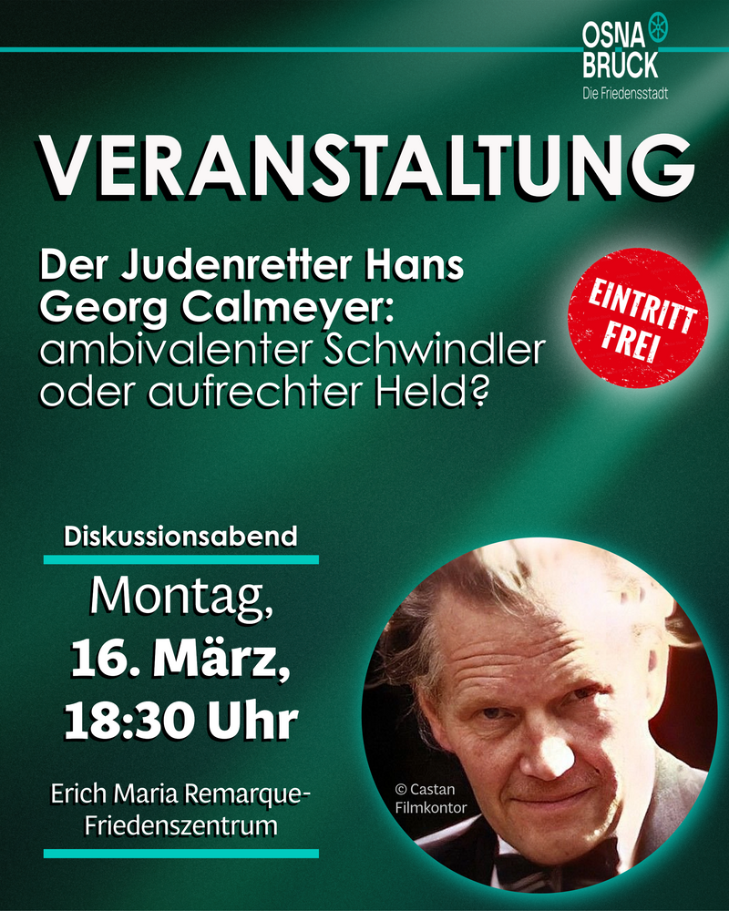 Über diese und weitere Fragen sprechen Dr. Sven Jürgensen, Leiter des Remarque-Friedenszentrums, und der Historiker und Vorsitzende der Calmeyer Initiative, Dr. Joachim Castan. Castan beschäftigt sich seit 1998 mit Calmeyer und zählt zu den ausgewiesenen Experten auf diesem Gebiet.
