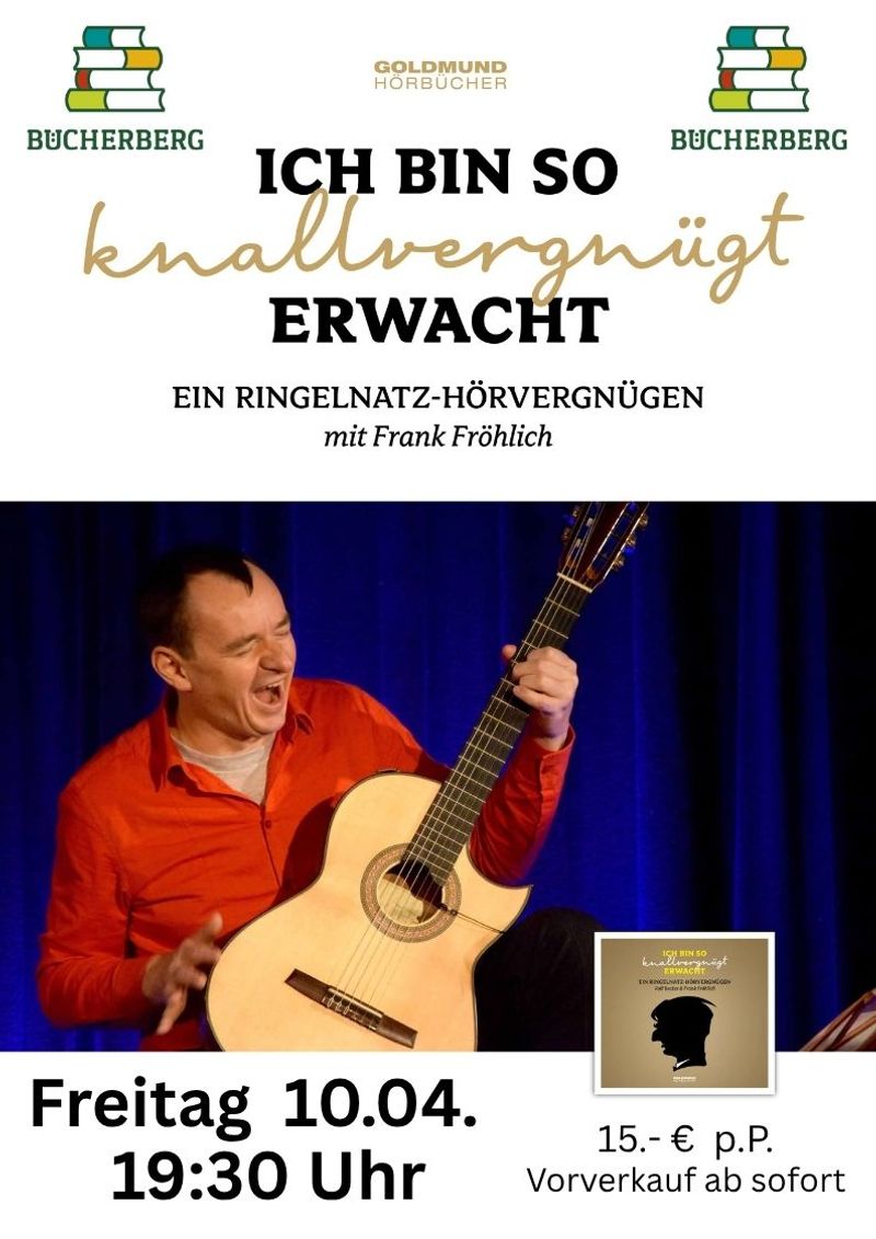 Mit einem leichten Augenzwinkern liest Frank Fröhlich die Gedichte von Ringelnatz – humorvoll, bisweilen nachdenklich , doch immer sehr unterhaltsam! Frank Fröhlich spielt, immer feinfühlig abgestimmt auf die Texte, Musik von La Paloma bis Bach in der ihm eigenen Spielfreude und Virtuosität. Kaum zu glauben, dass da nur eine(r) Gitarre spielt!