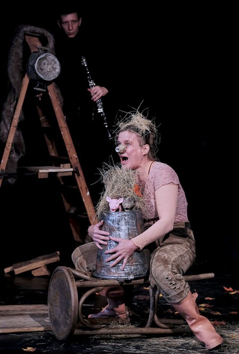Musikalische Erzählung nach einem englischen Märchen (3+) Wenn der Herbst kommt, wird es kalt und eine warme Hütte wäre fein. Die drei Schweinchen machen sich ans Werk und schnell ist das erste Haus gebaut. Aber wird das Häuschen auch stabil genug sein, um sie vor dem hungrigen Wolf zu schützen? Mit Klarinette, Stroh, Stein und Holz werden die Schweinchen und der Wolf rasant über die Bühne gejagt. Mit seinen berührenden und poetischen Inszenierungen zählt das Kranewit Theater zu den interessantesten Figuren- und Objekttheatern Deutschlands. Mit dem Einsatz einfachster Materialien wie Papier, Holz oder Draht entwickelte das Theater eine ganz eigenständige und durch ihre große ästhetische Kraft oft verblüffend intensive Bildersprache. Zwischen dem T-Werk und der Figurenspielerin Kristina Feix, die das Kranewit Theater mitbegründete, besteht eine enge Zusammenarbeit und so ist sie auch an mehreren T-Werk-Produktionen beteiligt. Foto: Neumann